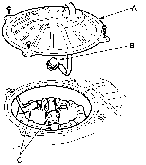 7. Remove the locknut (A), the fuel tank unit (B), and the locknut plate (C).