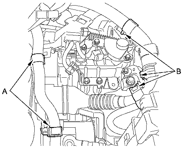 19. Install the heater hose clamps (A) and IMA motor power cable clamp (B).