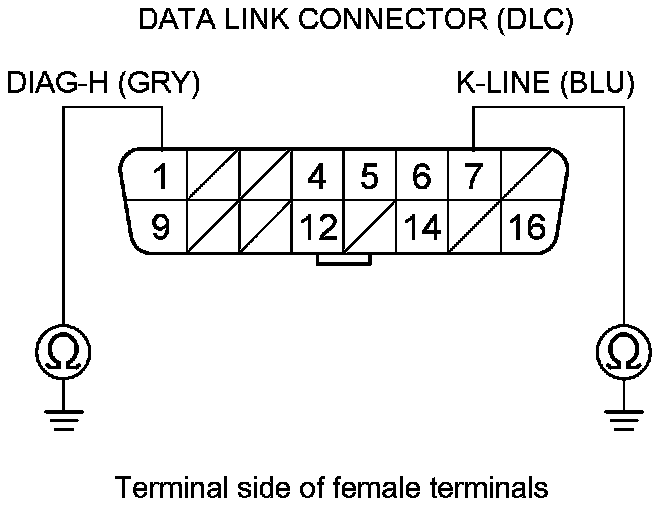 17. Check for continuity between body ground and DLC terminals No. 1 and No. 7 individually.
