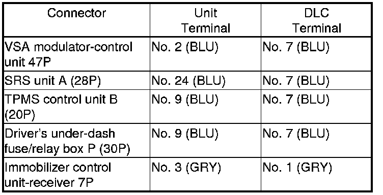 Repair short in the wire between DLC terminal No. 7 (K-line) and the VSA modulator-control unit, the SRS unit, the TPMS control unit, driver's under-dash fuse/relay box, the PCM ('07 model), or DLC terminal No. 1 (DIAG-H line) and the immobilizer control unit receiver.�