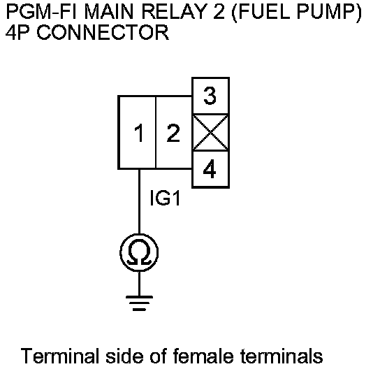 37. Check for continuity between body ground and PGM-FI main relay 1 (FI MAIN) 4P connector terminals No. 1 and No. 4 individually.
