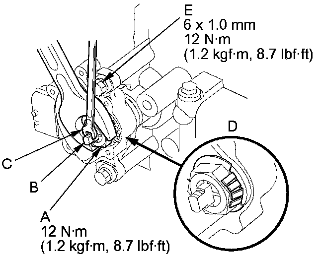 15. Tighten the bolts (E) securing the transmission range switch to 12 Nm (1.2 kg-m, 8.7 lb-ft).