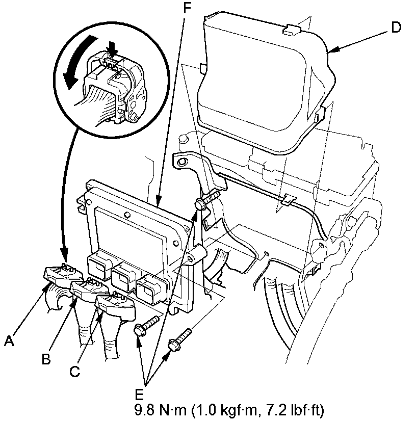 15. Loosen or remove the bolts (E), then remove the PCM (F).