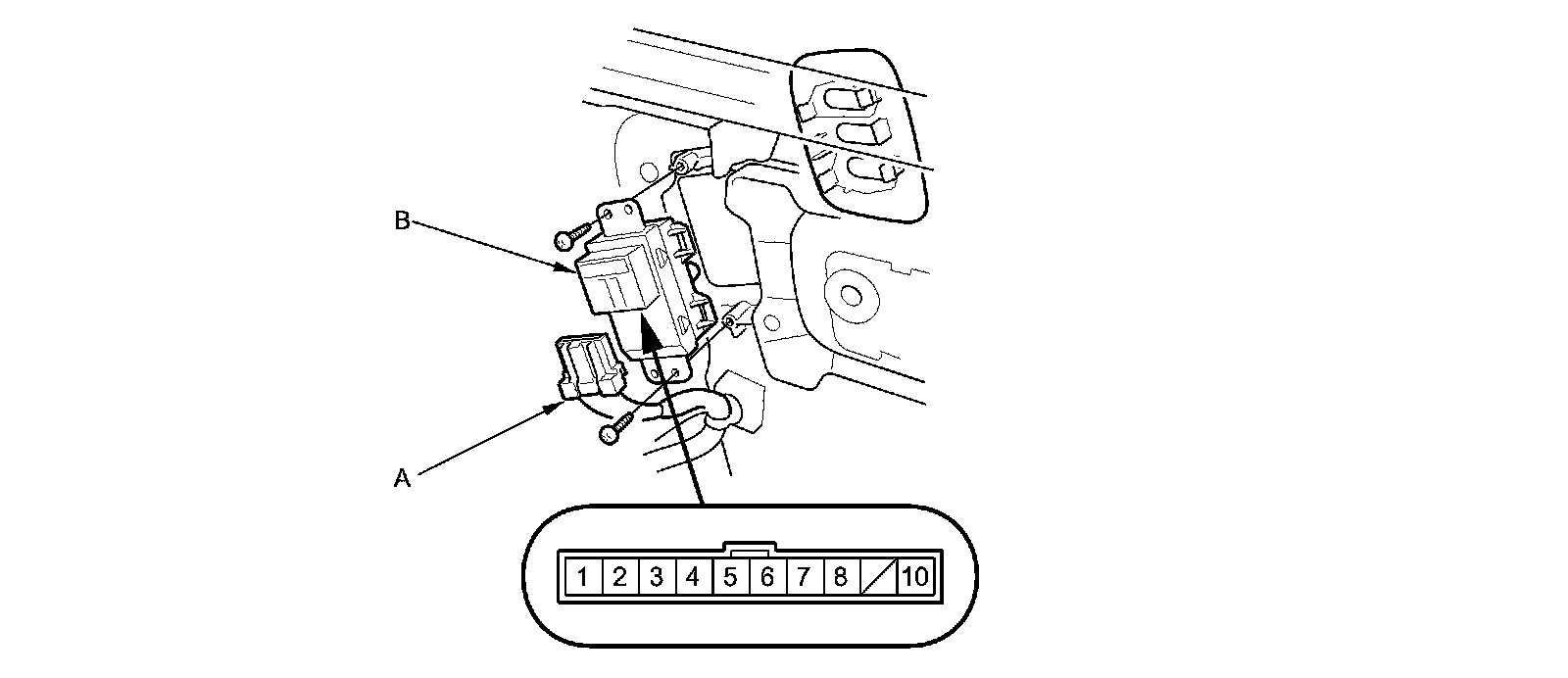2. Disconnect the 10P connector (A) from the driving position memory switch (B).
