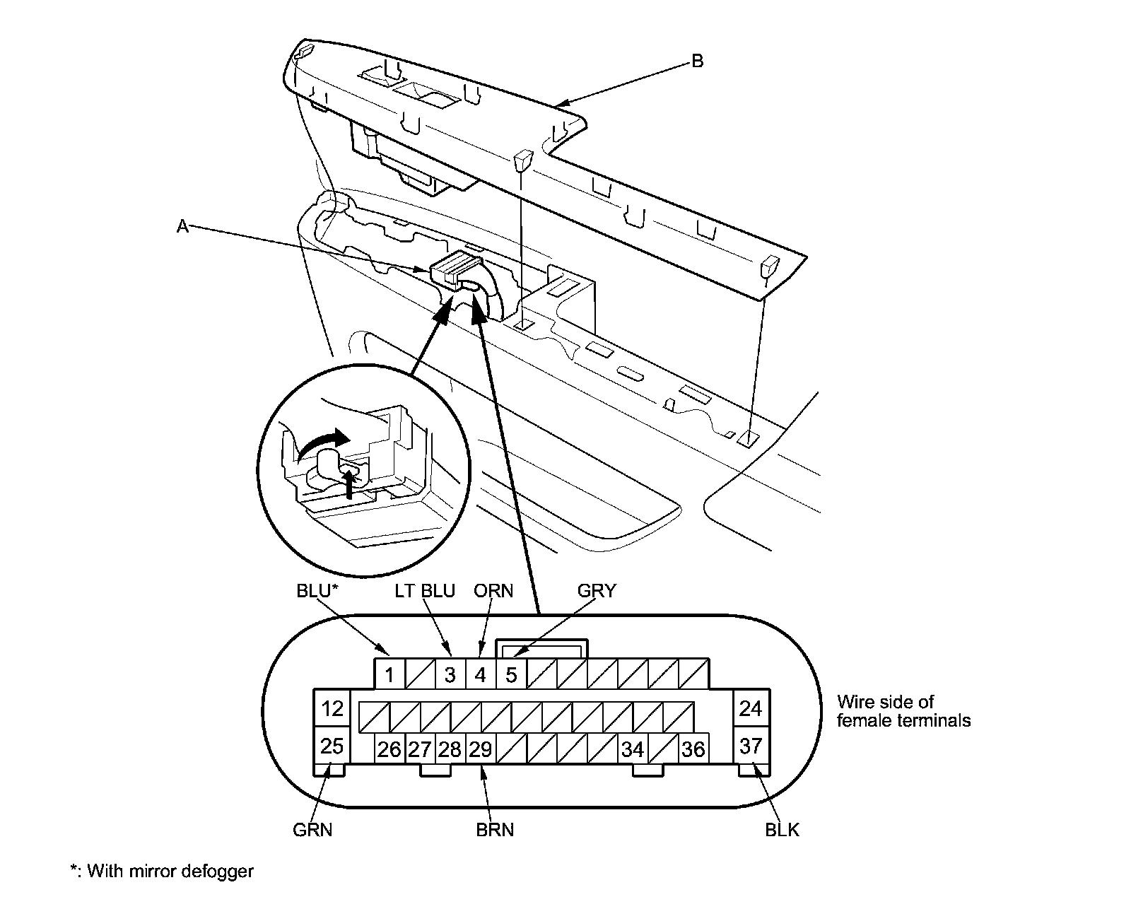 NOTE: When testing for defogger function, holding a cup of hot water near the mirror glass will form steam that can assist in diagnosing a broken or under-performing defogger.