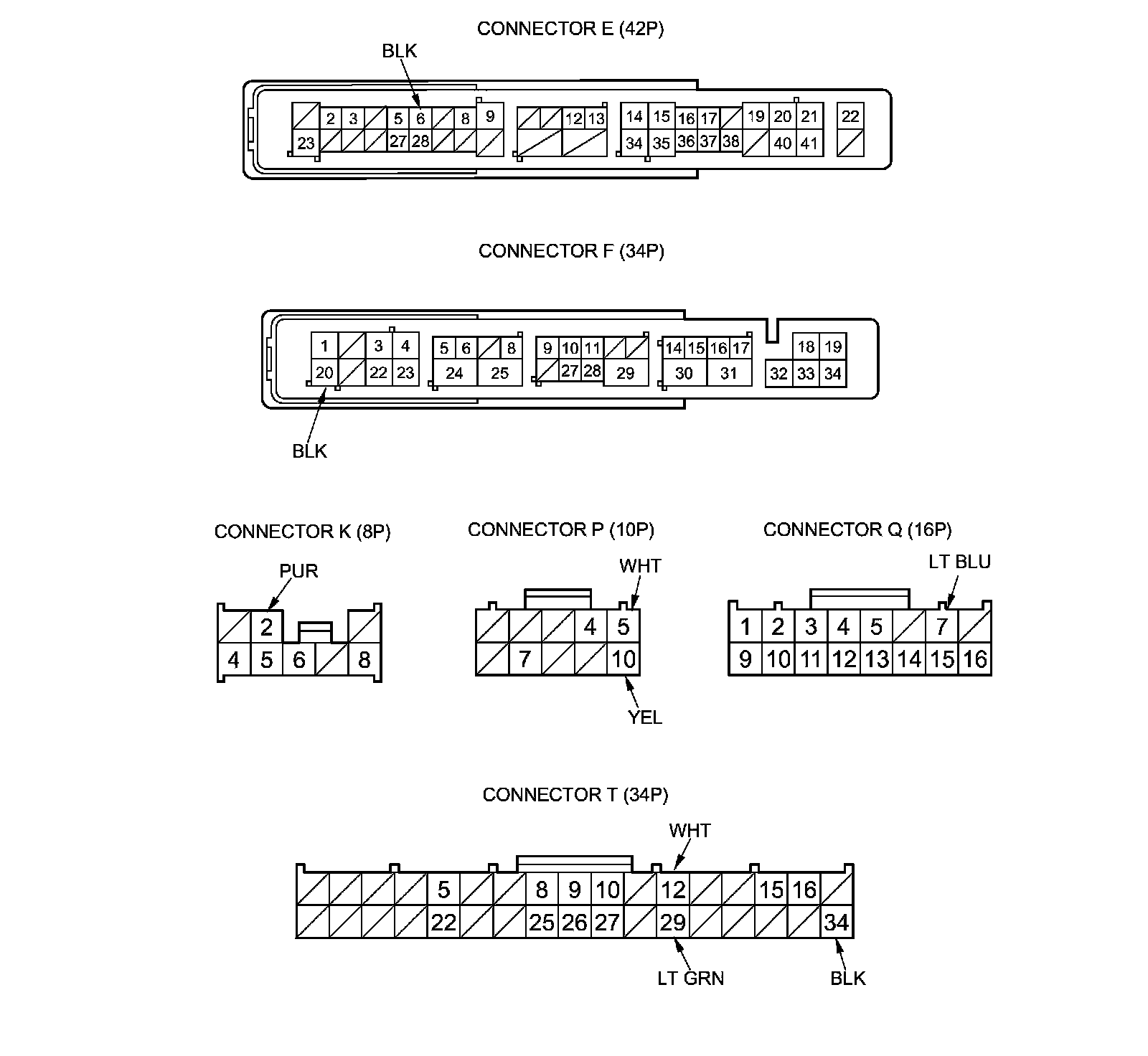 3. Disconnect under-dash fuse/relay box connectors E, F, K, P, Q, R, and T.