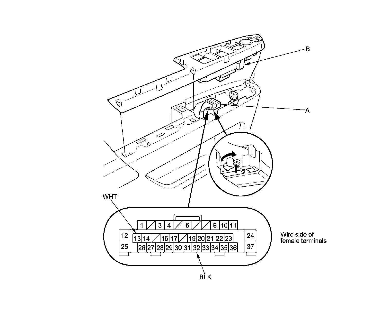 8. Disconnect the 37P connector (A) from the power window master switch (B).