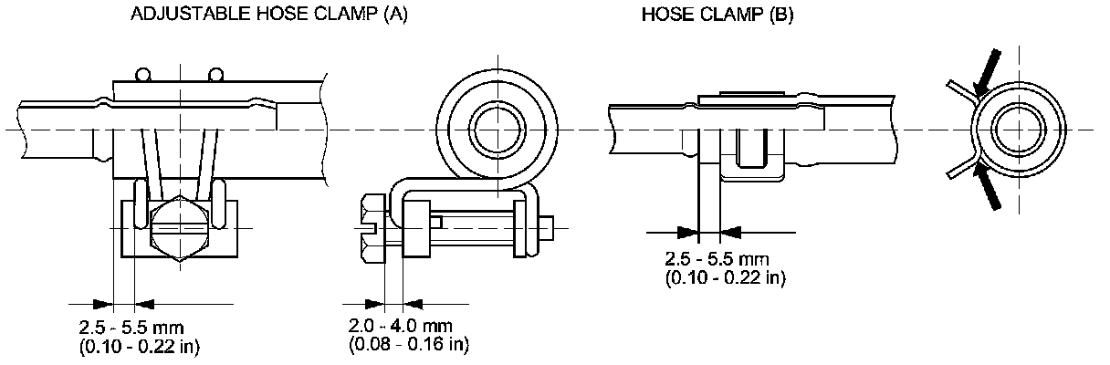 - Connect each hose to the corresponding line securely until it contacts the stop on the line. Install the clamp or adjustable clamp at the specified distance from the hose end as shown.