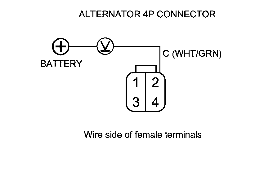 7. Measure the voltage between alternator 4P connector terminal No. 2 and the positive terminal of the battery.