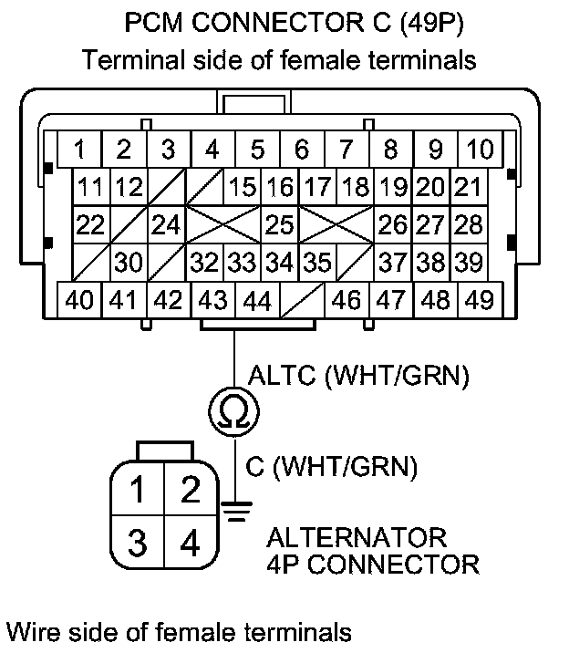 13. Check for loose terminals and connections, then check for continuity between PCM connector terminal C43 and alternator 4P connector terminal No. 2.