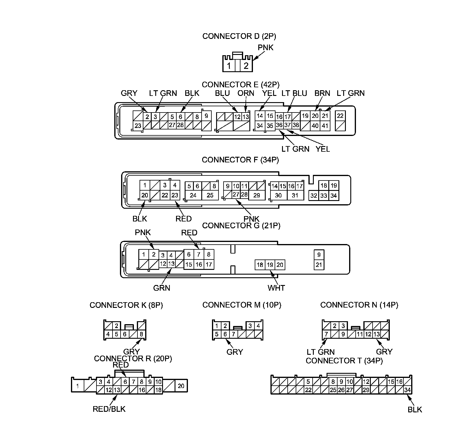 2. Disconnect under-dash fuse/relay box connectors D, E, F, G, K, M, N, R, and T.