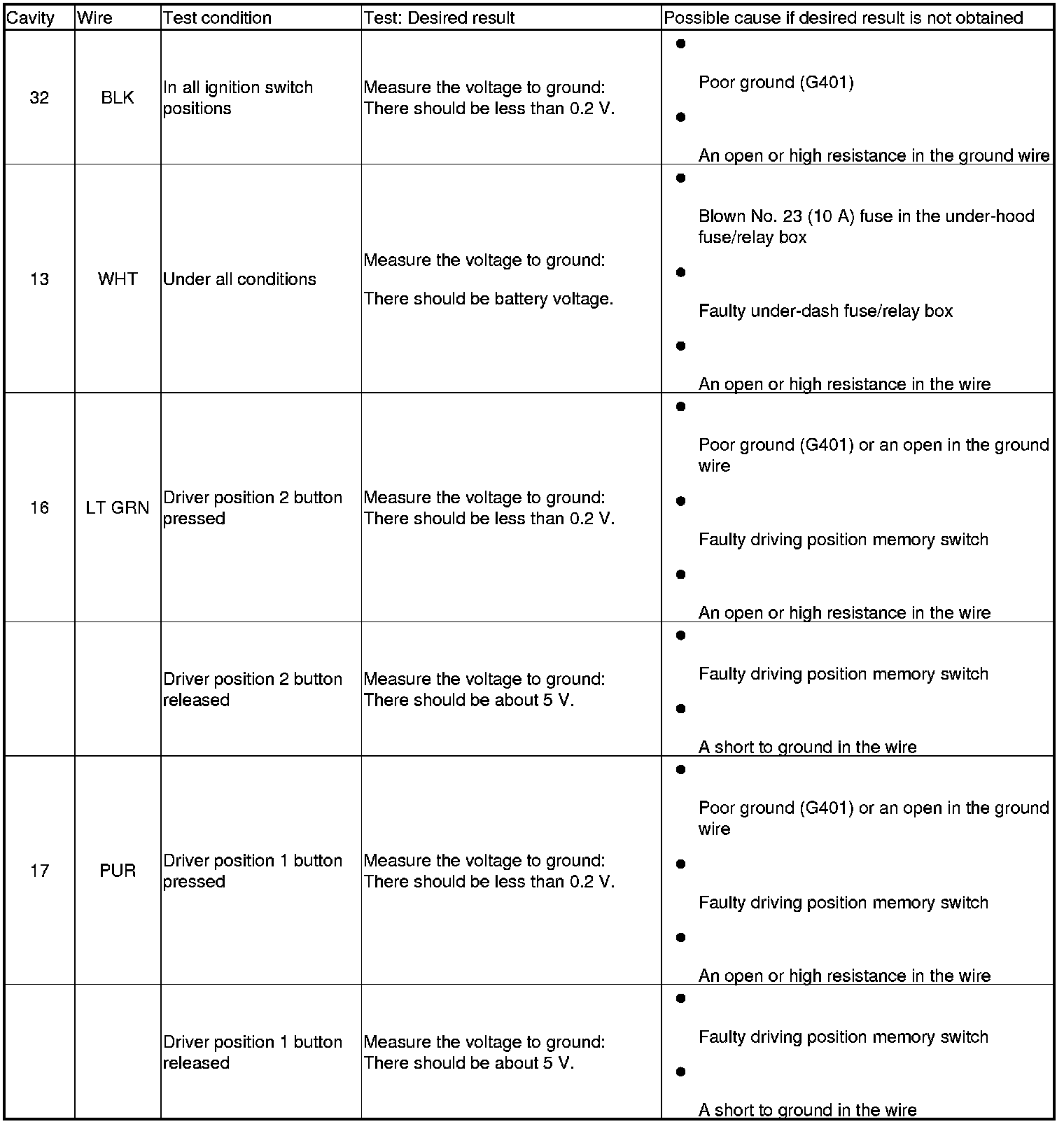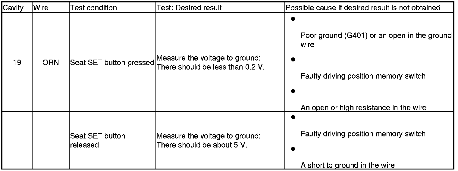 Home >> Honda >> 2010 >> Pilot 4WD V6-3.5L >> Repair and Diagnosis >> Windows and Glass >> Windows >> Testing and Inspection >> Component Tests and General Diagnostics >> Driving Position Memory System (Power Window Master Switch) Input Test