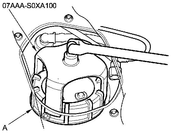6. Using the special tool, loosen the fuel tank unit locknut (A).