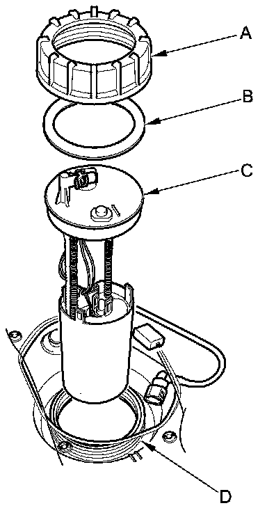 7. Remove the locknut (A), the locknut plate (B), the fuel tank unit (C), and the base gasket (D).