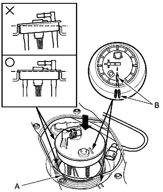 3. Align the marks (B) on the fuel tank and the fuel tank unit, then insert the fuel tank unit into the fuel tank until the fuel tank unit rests on top of the base gasket.