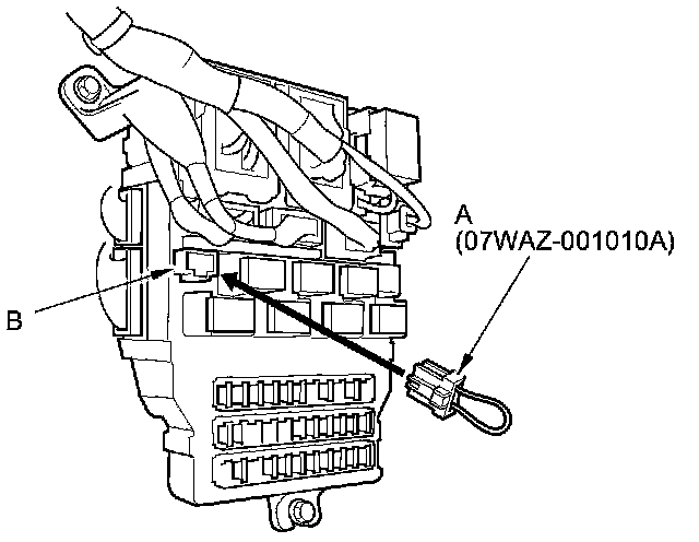 4. Connect the MPCS service connector (A) to the multiplex control inspection connector socket (B) in the under-dash fuse/relay box.