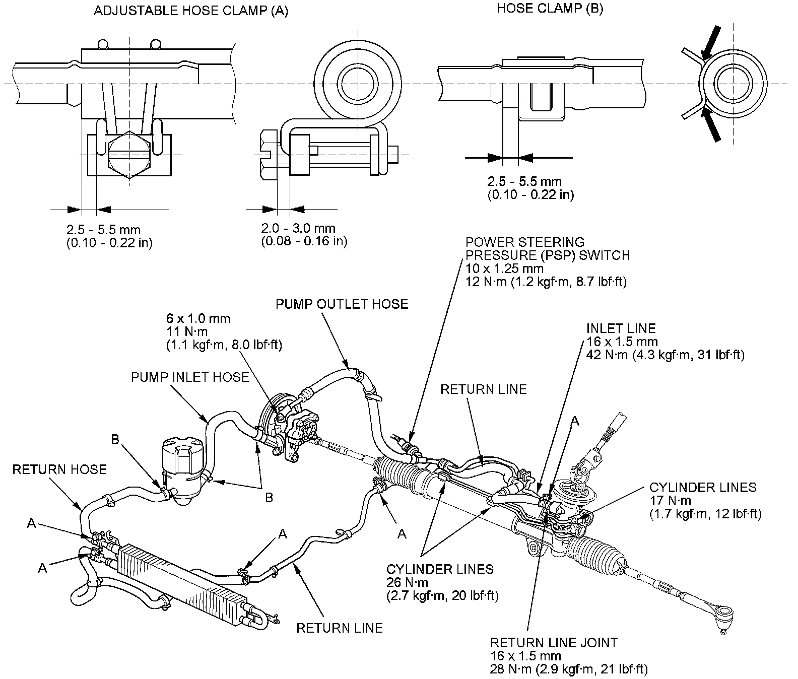 - Connect each hose to the corresponding line securely until it contacts the stop on the line. Install the clamp or adjustable clamp at the specified distance from the hose end as shown.
