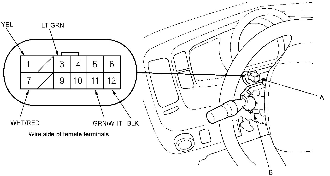 2. Disconnect the 12P connector (A) from the combination switch (B).