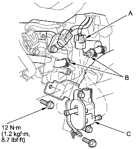 1. Disconnect the connector (A) and hoses (B) from the EVAP canister purge valve (C), then remove the EVAP canister purge valve assembly.