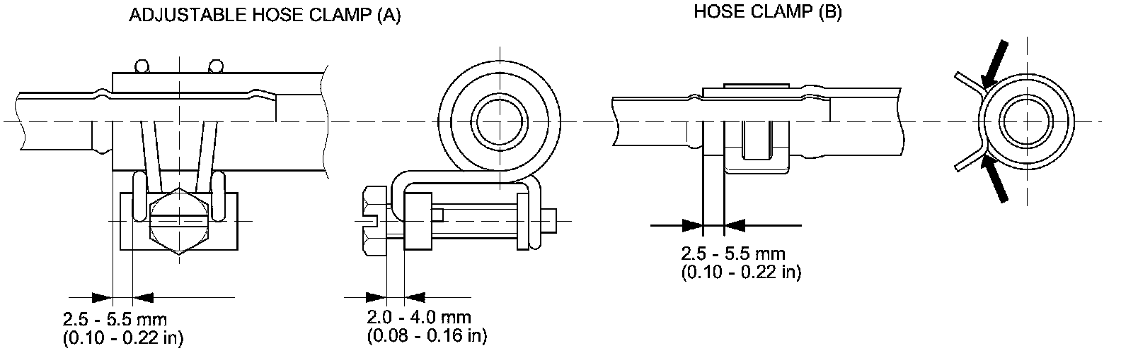 - Connect each hose to the corresponding line securely until it contacts the stop on the line. Install the clamp or adjustable clamp at the specified distance from the hose end as shown.