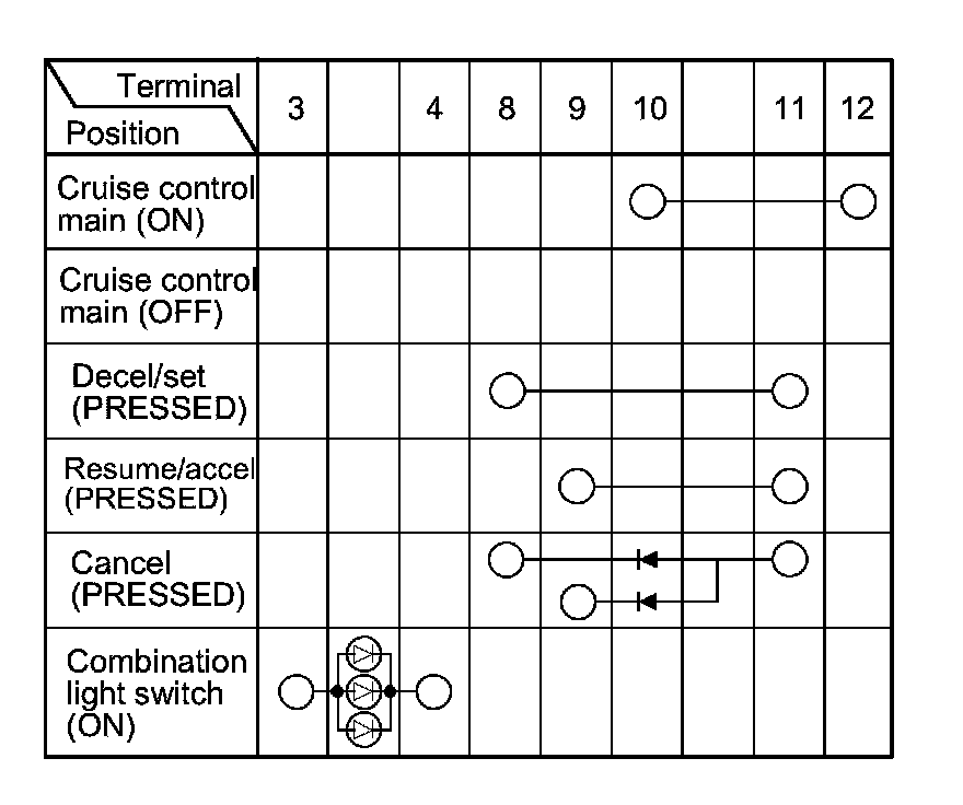 3. Check for continuity between the terminals in each cruise control combination switch position according to the table.