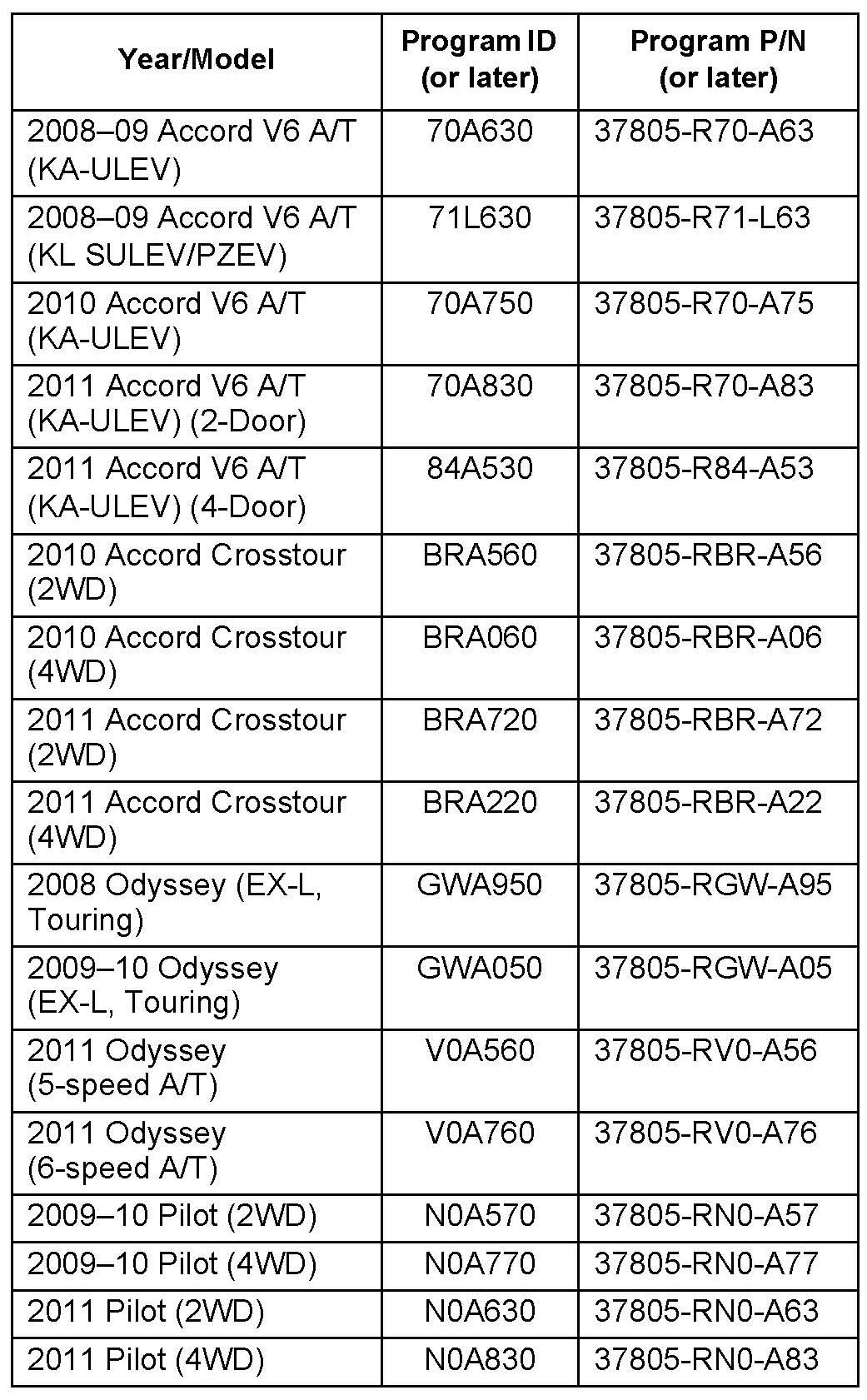 The updated PGM-FI software program IDs and P/Ns
