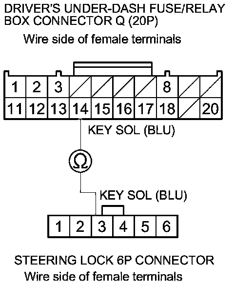 13. Check for continuity between driver's under-dash fuse/relay box connector Q (20P) terminal No. 14 and steering lock 6P connector terminal No. 3.