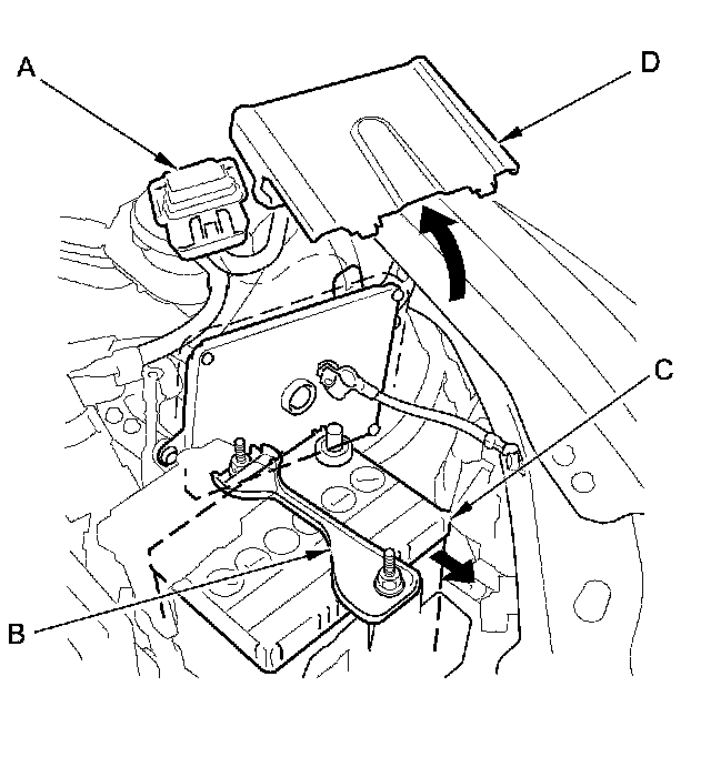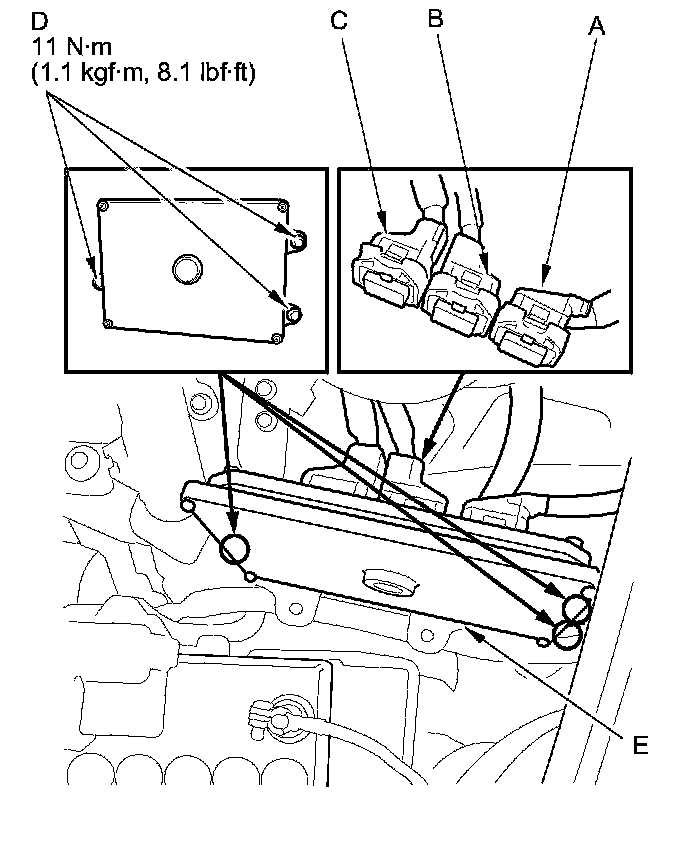 14. Disconnect ECM/PCM connectors A, B, and C, then remove the ECM/PCM (E).