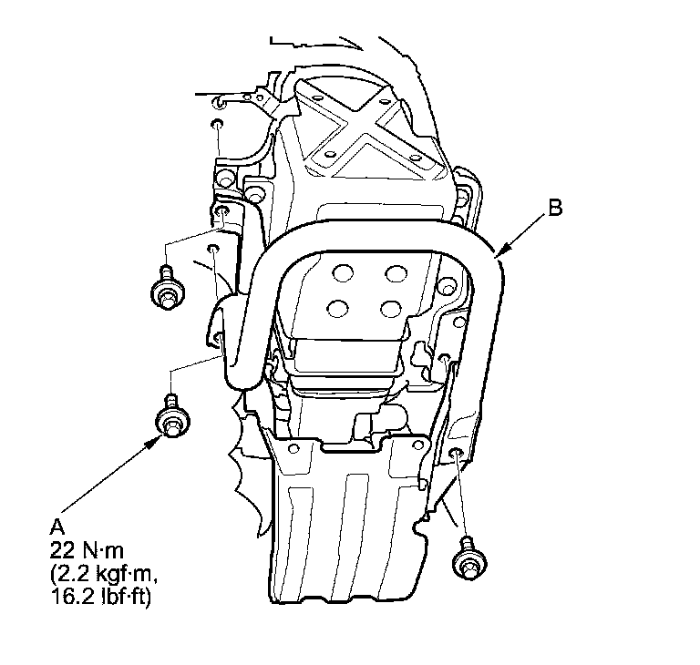 2. Remove the bolts (A), then remove the EVAP canister guard (B).