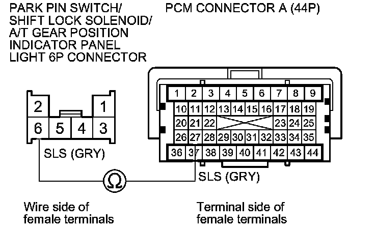 22. Check for continuity between PCM connector terminal A27 and park pin switch/shift lock solenoid/A/T gear position indicator panel light 6P connector terminal No. 6.