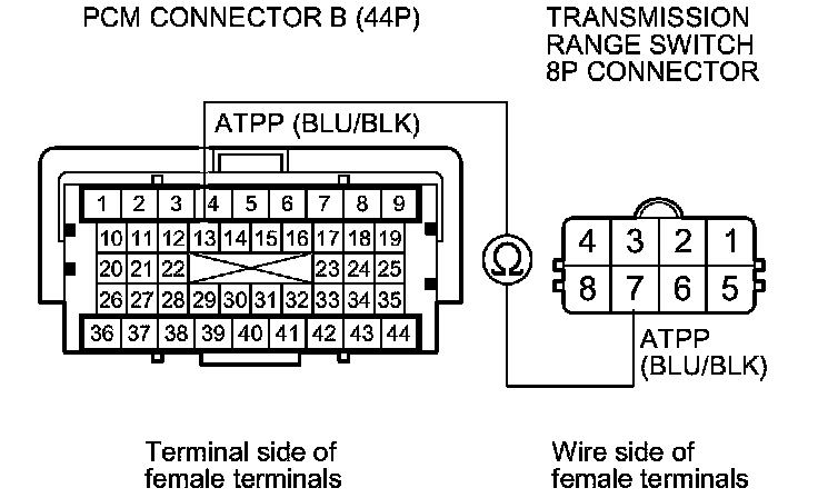 Repair an open in the wire between PCM connector terminal B13 and the transmission range switch 8P connector.�