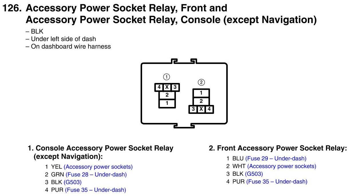 View 126 - Accessory Power Socket Relay, Front And Accessory Power Socket Relay, Console Connector View (Except Navigation)