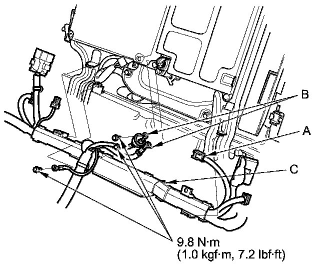 6. Remove the A/C compressor power cable connector (B), and the motor power cables (C), then wrap them with insulating tape.