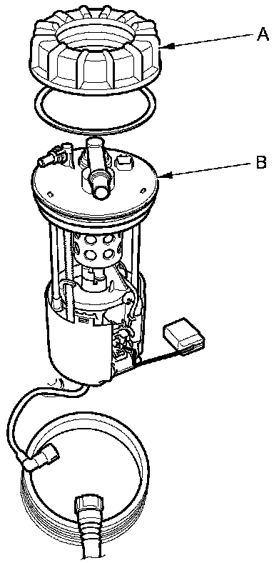 4. Remove the locknut (A) and the fuel tank unit (B).