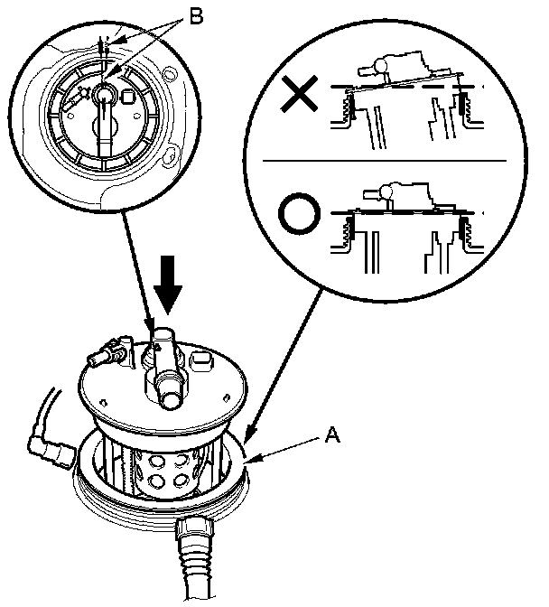 3. Align the marks (B) on the fuel tank and the fuel tank unit, then insert the fuel tank unit into the fuel tank until it sits on the base gasket.