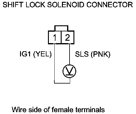 11. Release the brake pedal, and measure the voltage between shift lock solenoid connector terminals No. 1 and No. 2. The shift lever must be in P.