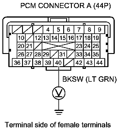 20. Measure the voltage between PCM connector terminal A40 and body ground while pressing the brake pedal and when the brake pedal is released.