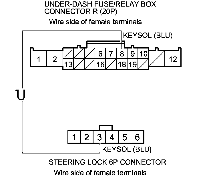 12. Check for continuity between under-dash fuse/relay box connector R (20P) terminal No. 8 and steering lock 6P connector terminal No. 3.