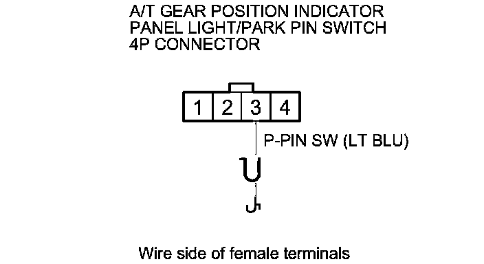 17. Check for continuity between A/T gear position indicator panel light/park pin switch 4P connector terminal No. 3 and body ground.