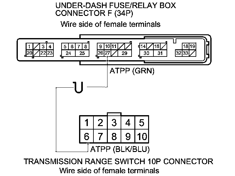 22. Check for continuity between under-dash fuse/relay box connector F (34P) terminal No. 27 and transmission range switch 10P connector terminal No. 6.