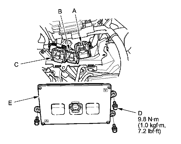 14. Remove the bolts (D), then remove the ECM/PCM (E).