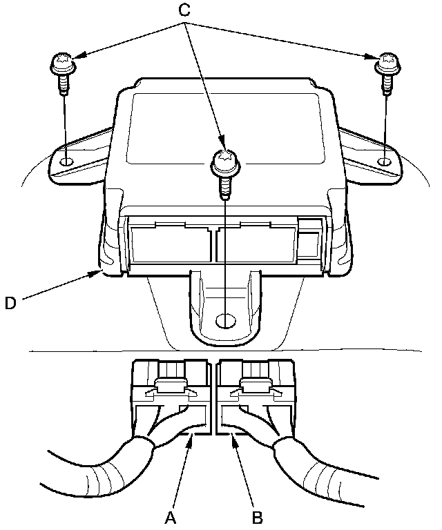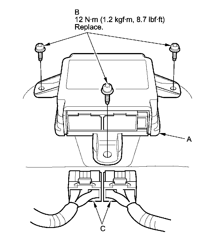 1. Install the SRS unit (A) with the new TORX bolts (B), using a TORX T30 bit, then connect the connectors (C) to the SRS unit; push them into position until they click.