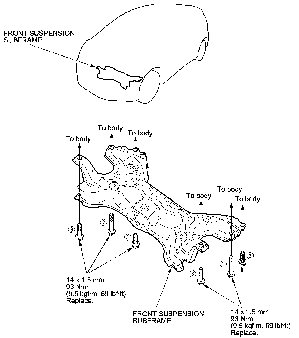 - After loosening the subframe mounting bolts, be sure to replace them with new ones.