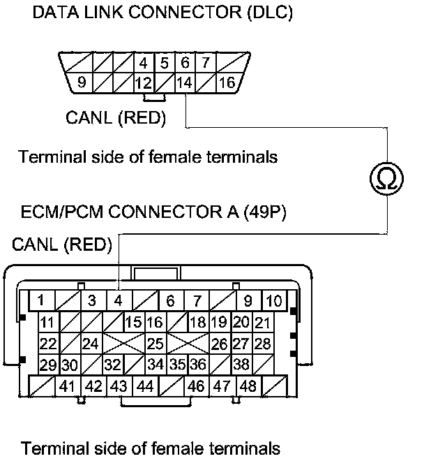34. Check for continuity between ECM/PCM connector terminal A3 and DLC terminal No. 6.