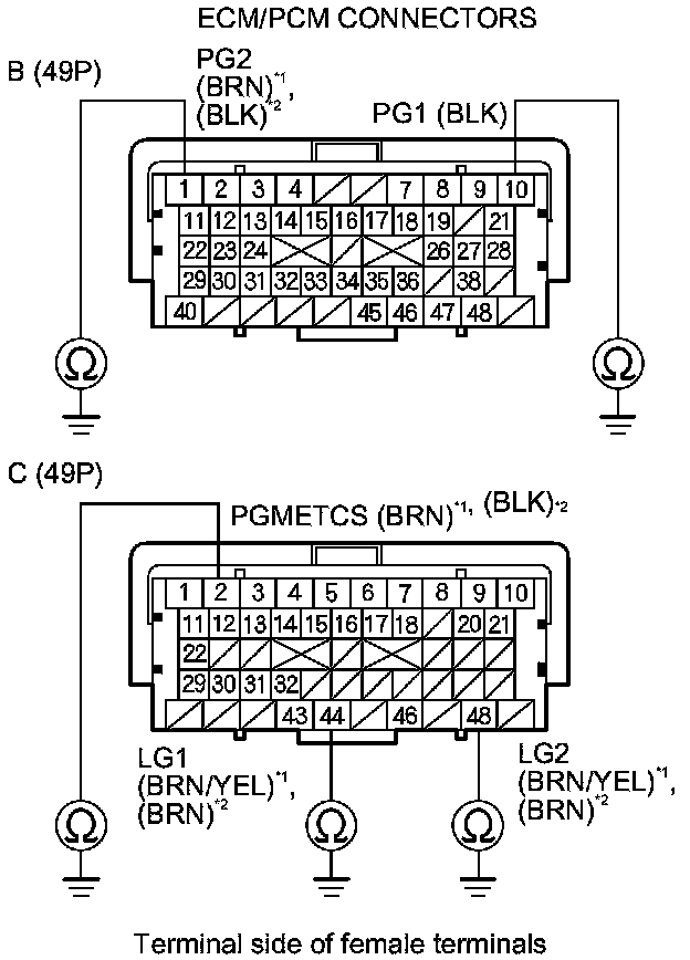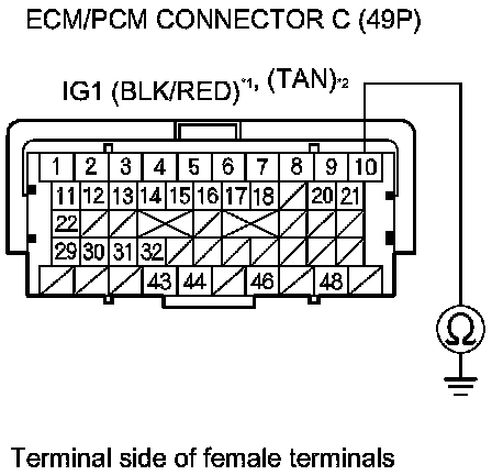 73. Check for continuity between body ground and ECM/PCM connector terminals B1, B10, C2, C44, and C48 individually.