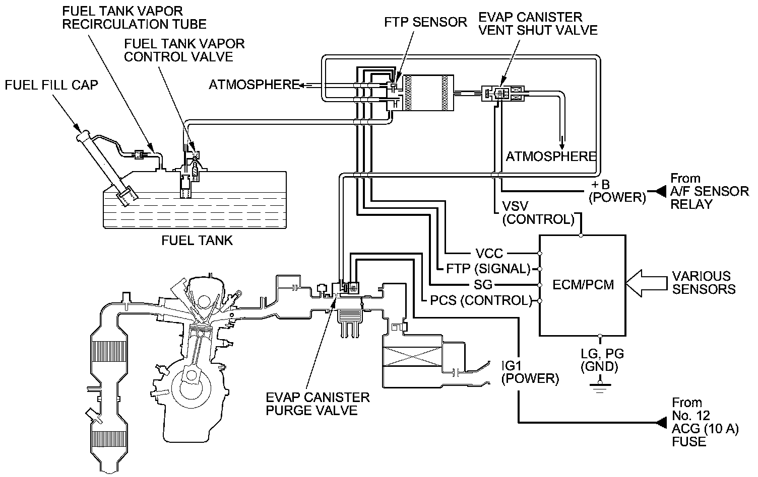The EVAP controls minimize the amount of fuel vapor escaping to the atmosphere. Vapor from the fuel tank is temporarily stored in the EVAP canister until it can be purged from the canister into the engine and burned.