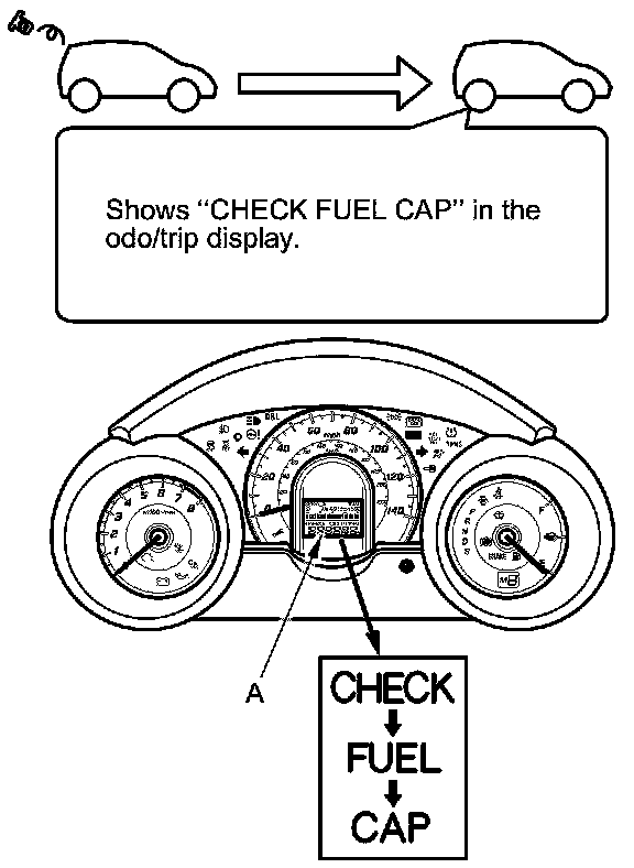 The first time a leak is detected, a CHECK FUEL CAP message appears on the odo/trip display (A). To scroll to another message, press the select/reset button. The CHECK FUEL CAP message appears each time you restart the engine until the system turns the message off. Turn the engine off, then replace or tighten the fuel fill cap until it clicks at least once.