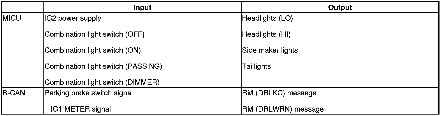 The MICU control of the headlights as daytime running lights based on input from each switch and B-CAN data.