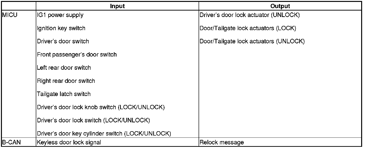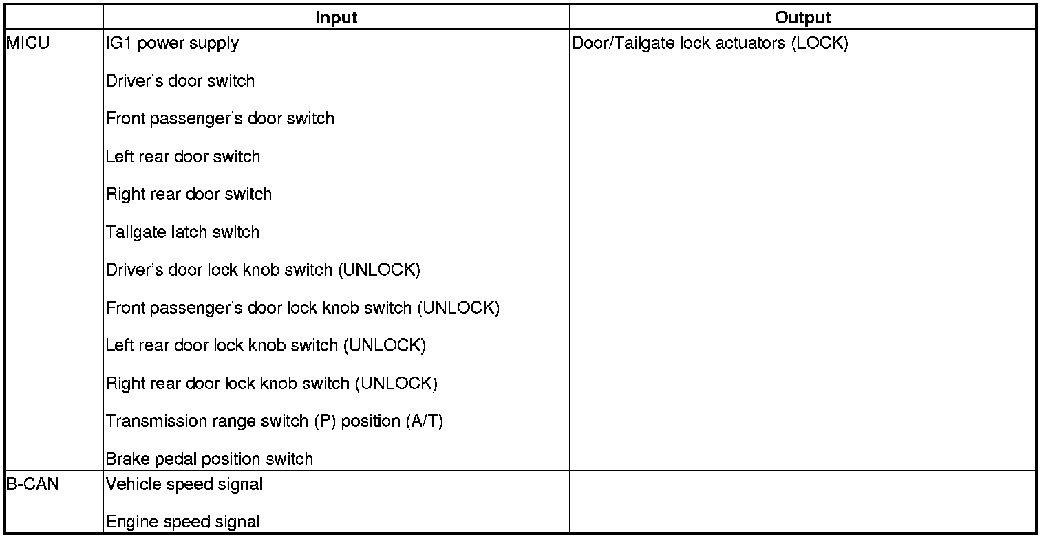 The MICU control of the door lock actuators is based on inputs from each switch and B-CAN data.