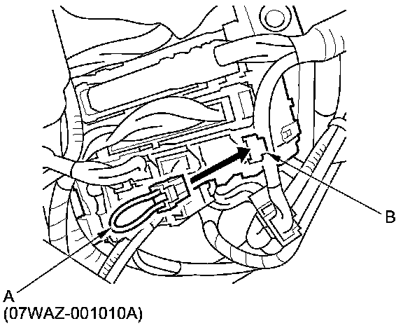 4. Connect the MPCS service connector (A) to the multiplex control inspection connector socket (B) in the under-dash fuse/relay box.